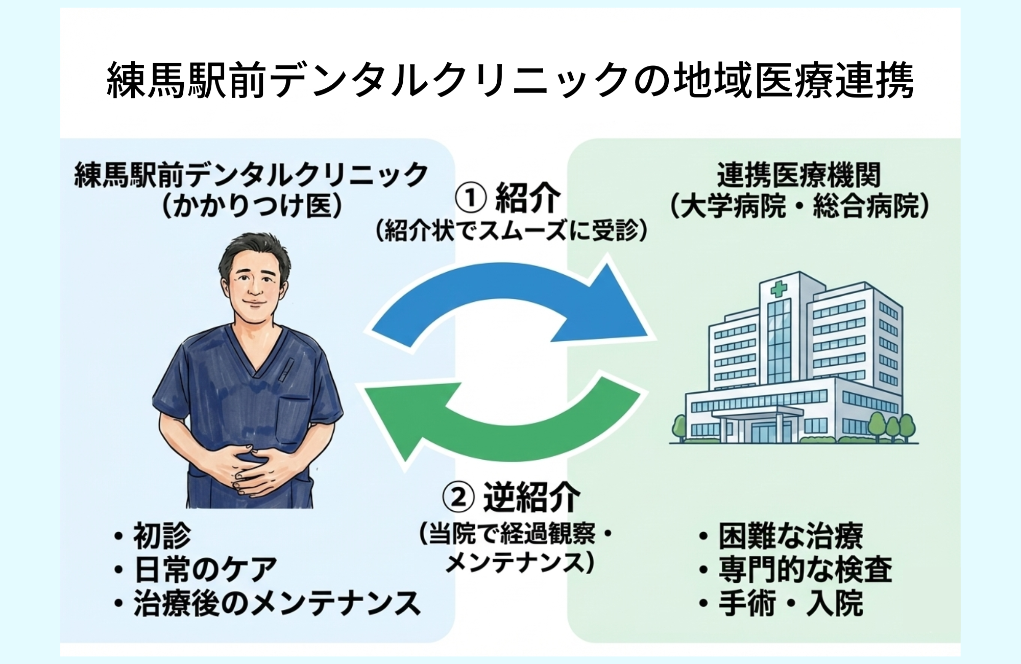 当院での治療継続が難しい場合は、医療連携している地域医療支援病院(総合病院)から、患者さまにとって最適な病院をご紹介します。