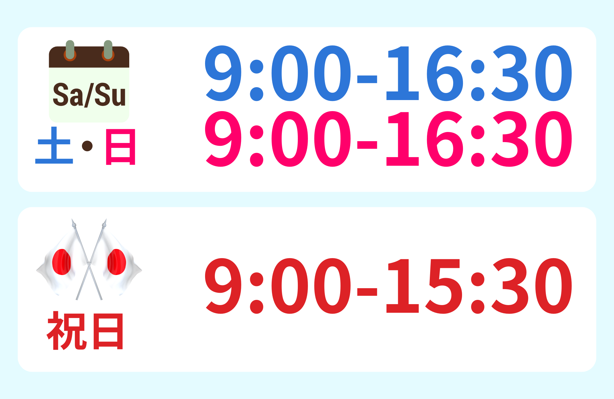 土曜日と日曜日は朝9時〜夕方16時30分まで(一般診療の場合)、祝日は15時30分まで診療受付しております。平日に時間が取れない方も通いやすいです。