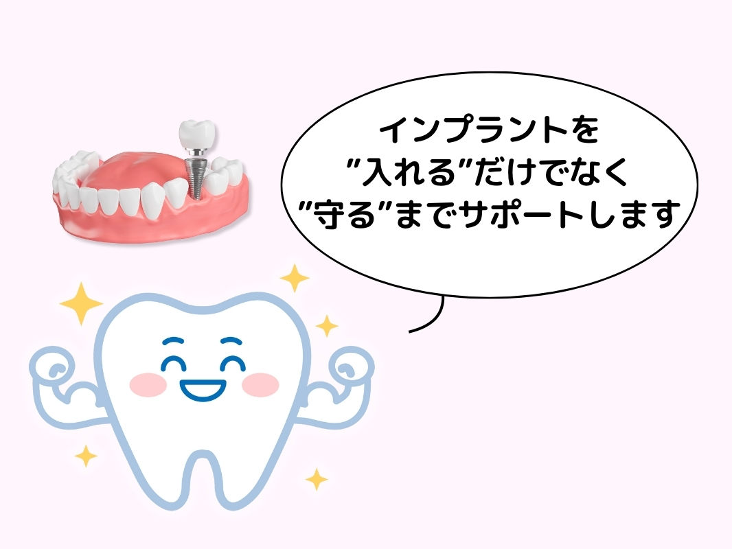 インプラントは自費診療であるため、検討するときはとても慎重になるかと思います。そのため、インプラント治療では治療そのものに焦点を当てることが多いですが、実は治療前の段階から、治療後のメンテナンスまでをお考えいただく必要があります。治療自体は約3か月になりますが、治療後は10年20年と快適に使っていただきたいからです。