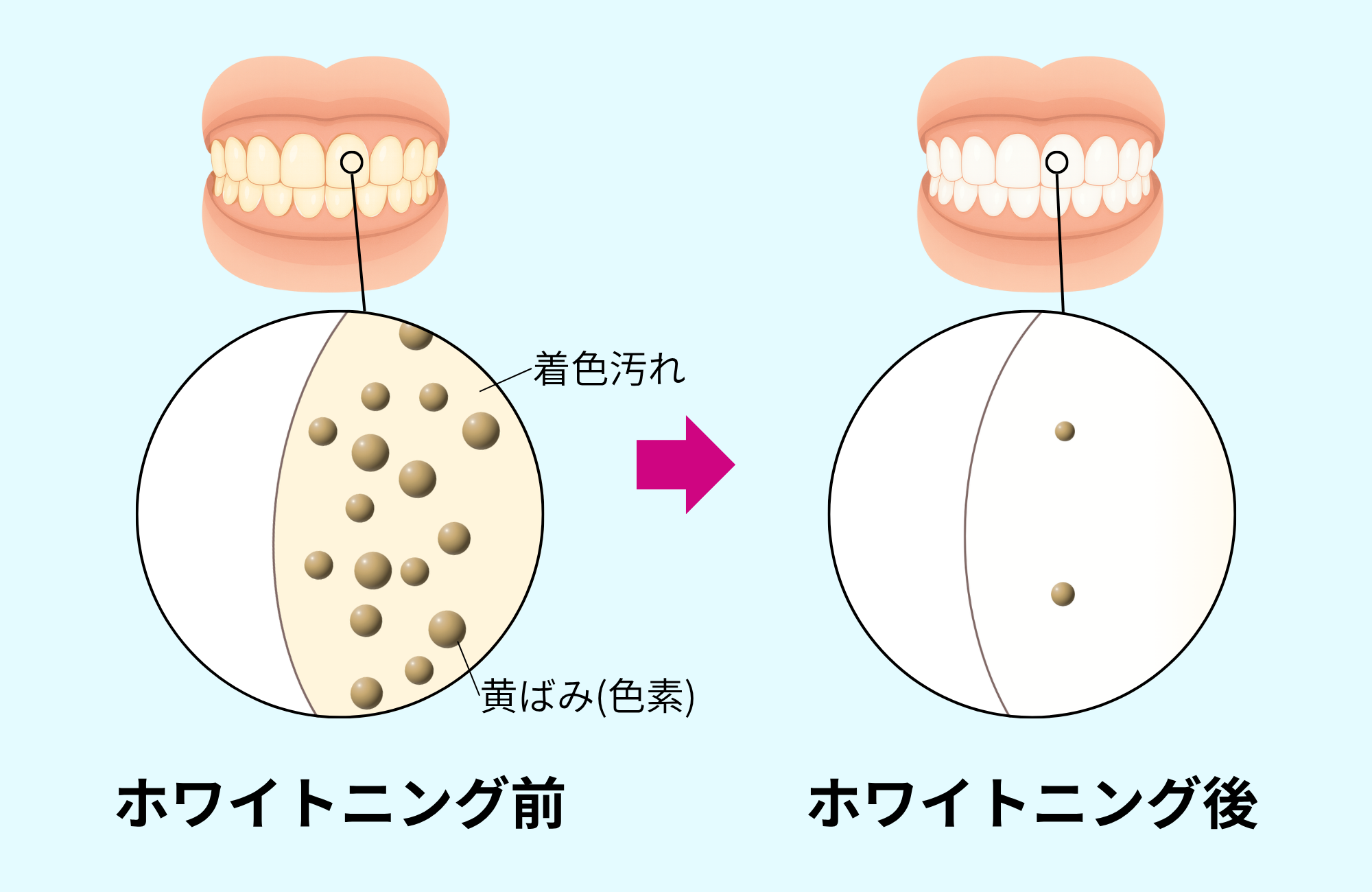・歯の表面についた着色汚れを除去 ・歯の内部に沈着した色素を分解 |